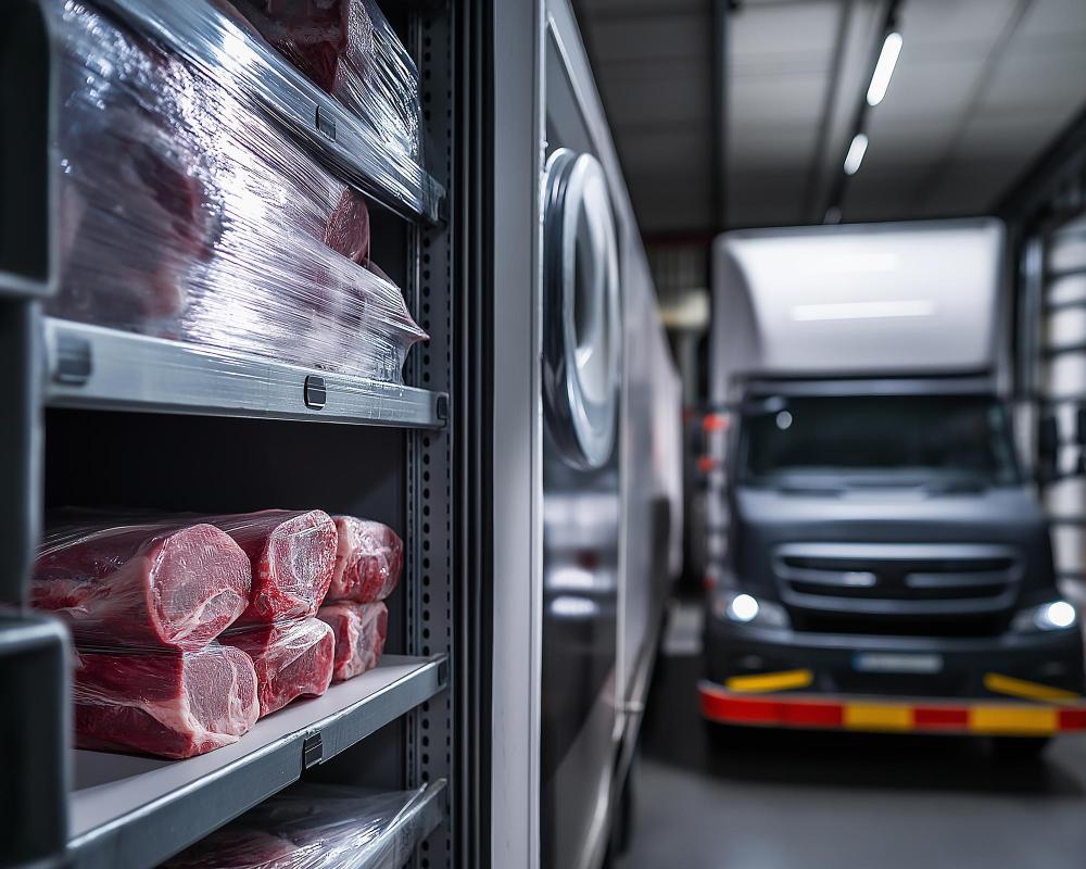 Traslado de productos cárnicos en camión frigorífico, manteniendo la cadena de frío y las condiciones óptimas durante todo el recorrido.